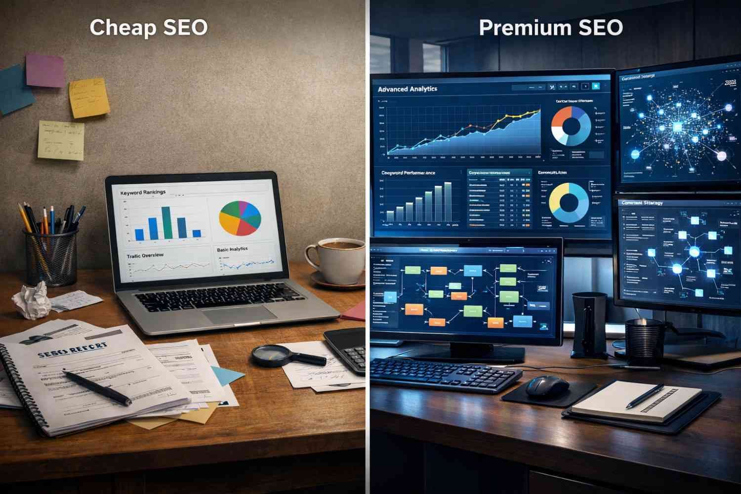 Cheap SEO services typically deliver basic keyword research, limited on-page optimization, and templated content—often without the